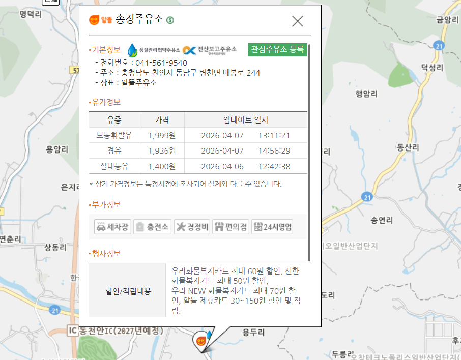 | 충남 천안 | NH-알뜰 | 천안농협 본점주유소 | 도심·외곽 연결 도로 인접 |