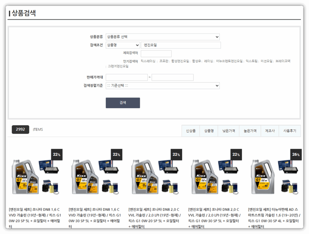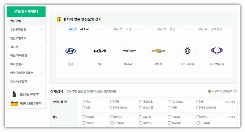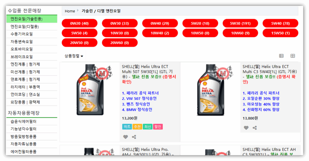 - 필터, 점도, 리터 수별 검색이 가능하고, 최저가 순으로 정렬하면 정말 저렴하게 구입할 수 있습니다.