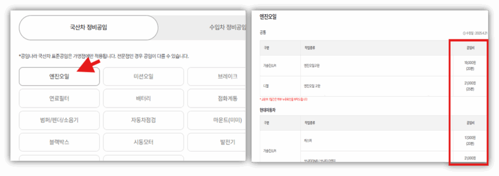 - 하단 링크에 접속한 후 엔진오일 항목을 선택하면, 브랜드별·차종별 엔진오일 교체 공임비를 확인할 수 있습니다.