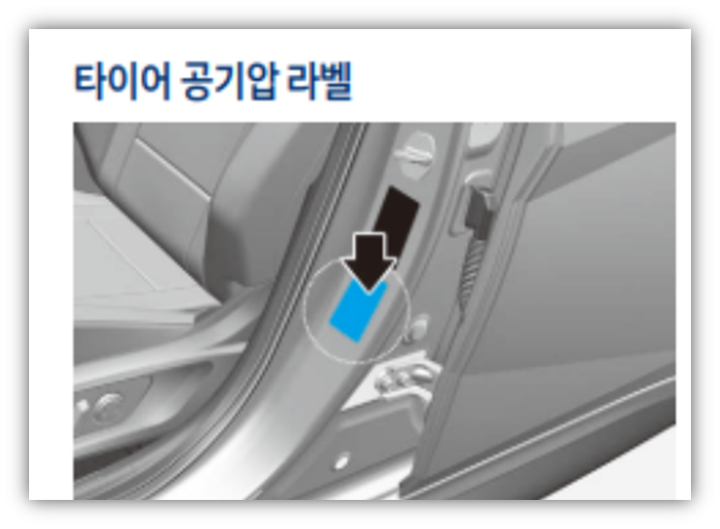규정 공기압은 차량 운전석 문짝 옆 라벨에 표시되어 있으며, 이를 기준으로 보충하는 것이 좋습니다.