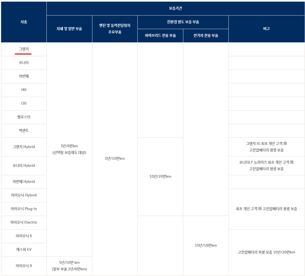 현대차는 차량을 구입한 후 일정 기간 동안 발생할 수 있는 주요 수리 비용을 지원하는 보증 정책을 제공합니다. 그랜저의 무상 보증 기간은 다음과 같습니다.