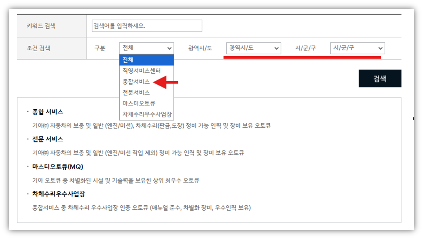 따라서 가까운 센터를 찾으시려면 기아 공식 홈페이지 또는 오토큐 검색 서비스를 활용해 종합 정비 서비스 가능 여부를 먼저 확인하는 것이 중요합니다. 지역과 항목을 선택하면 손쉽게 범퍼 수리 가능한 센터를 찾을 수 있으니 참고해 보시기 바랍니다.