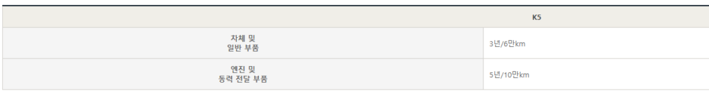 차량 보증 기간: K5의 기본 보증 기간은 3년 / 6만 km 입니다. 이 기간 동안 발생한 차량의 제조상 결함이나 품질 문제는 기아에서 무상으로 수리해줍니다. 다만, 외부 충격이나 사고로 인한 손상은 보증에서 제외됩니다.