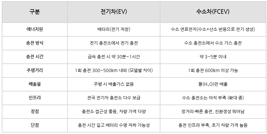 - 수소차(FCEV)는 충전 시간이 짧고 주행거리가 길다는 장점이 있지만, 충전소가 부족하다는 점이 현재 한계입니다.