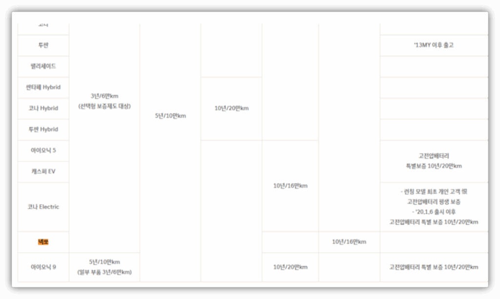 - 엔진 및 동력 계통: 5년 / 10만 km