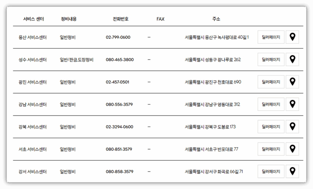 서비스센터 위치는 아래 정보를 확인해 보시기 바랍니다.