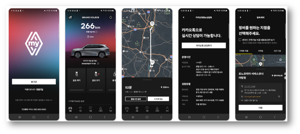 르노코리아가 제공하는 My Renault 앱을 통해 내 차 관리, 온라인 정비 예약 등 다양한 맞춤형 케어 서비스와 함께 차량 내 이지커넥트 연동 기능도 함께 사용할 수 있습니다.