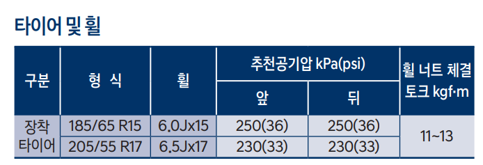 | 구분 | 형식 | 휠 | 추천공기압 kPa(psi) 앞 | 추천공기압 kPa(psi) 뒤 |