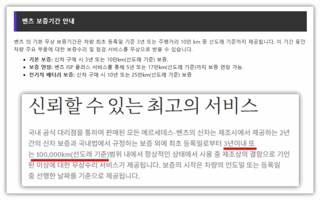 - 기본 보증: 신차 구매 시 3년 또는 10만km(선도래 기준) 보증.