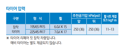 규정 공기압은 차량 운전석 문짝 옆 라벨에 표시되어 있으며, 이를 기준으로 보충하는 것이 좋습니다.