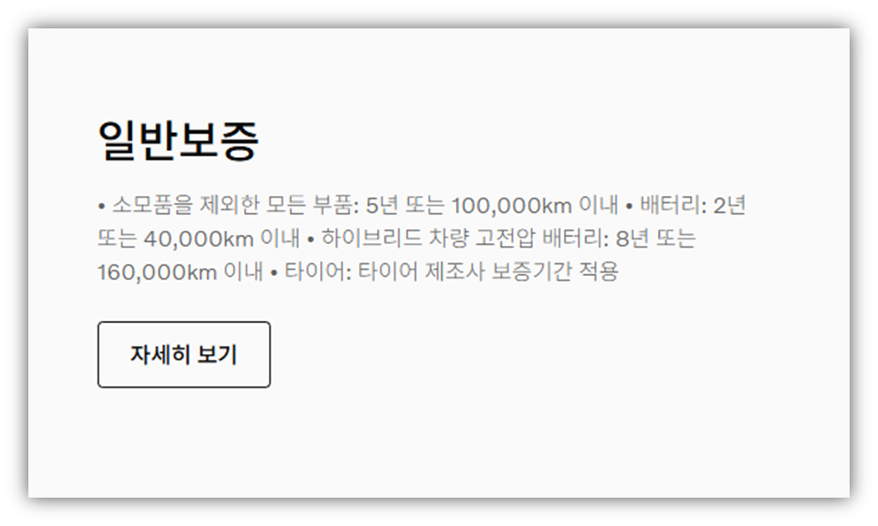 - 소모품을 제외한 모든 부품: 5년 또는 100,000km 이내