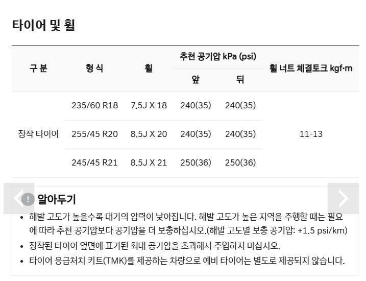 따라서 하이브리드 특성에 맞춰 권장 공기압을 유지하고, TPMS 경고등이 점등되면 센서 상태와 공기압 밸런스를 함께 점검하는 것이 좋습니다.