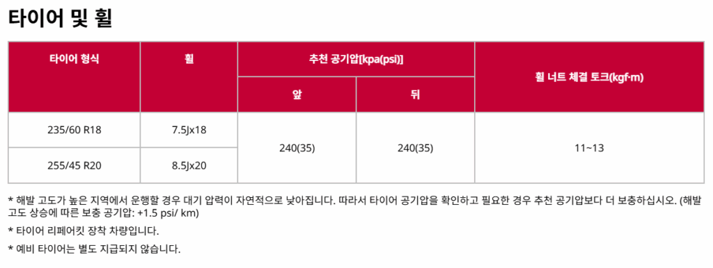 | 타이어 형식 | 휠 규격 | 추천 공기압 (kPa / psi) 앞 | 추천 공기압 (kPa / psi) 뒤 | 휠 너트 체결 토크 (kgf·m) |