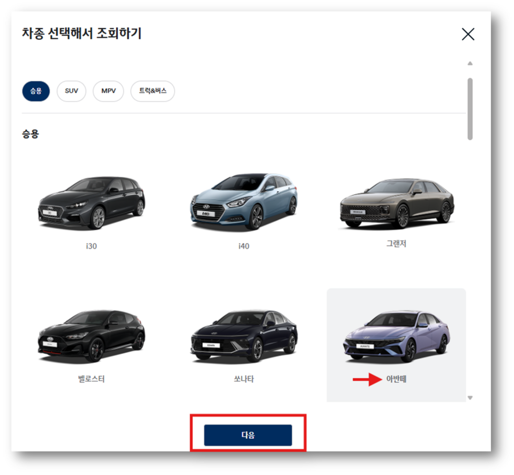 2. 아반떼 차량을 선택 후 다음을 클릭합니다.