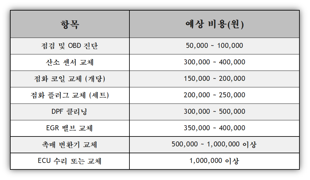 ※ 위 비용은 정비소, 지역, 차량 상태에 따라 달라질 수 있으며 정품, OEM, 사제 부품 여부에 따라서도 큰 차이가 발생할 수 있습니다.