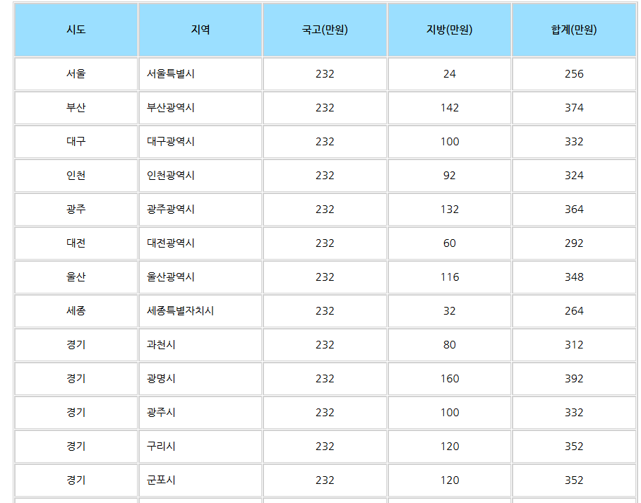 거주 지역의 보조금은 아래 표를 참조해 주시기 바랍니다.