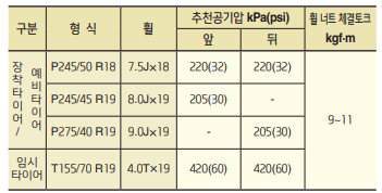 | 임시 타이어 | T155/70 R19 | 4.0T×19 | 420(60) | 420(60) |