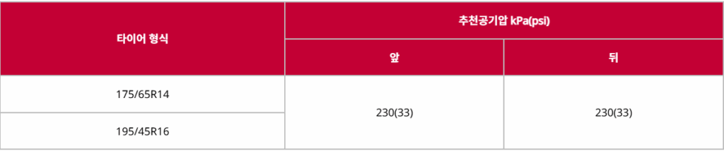타이어 형식추천 공기압 앞 kPa(psi)추천 공기압 뒤 kPa(psi)