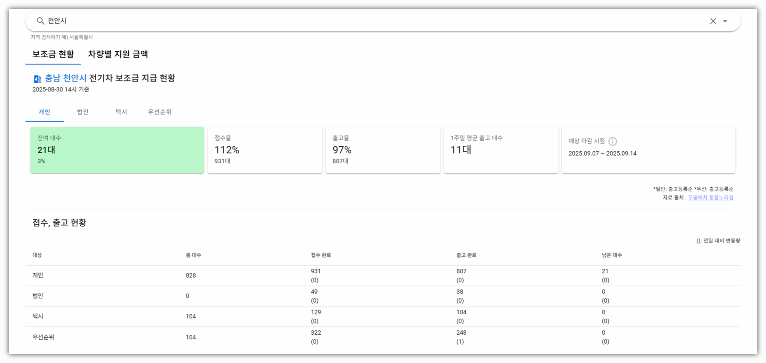 충남 천안시처럼 잔여 물량이 21대밖에 남지 않은 상황에서는, 하루 차이로도 혜택 여부가 달라질 수 있습니다.