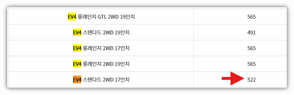 ※ EV4스탠다드 기준 약 4,250만원으로, 감액 없이 국고 보조금 522만원 전액 수령이 가능한 가격대에 속합니다.