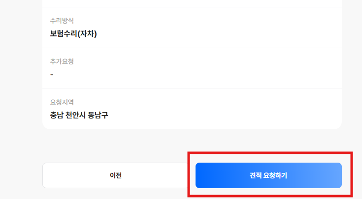 차량번호, 차종, 제조사 정보를 입력하면 차량 등록이 완료되며, 수리 견적의 정확도를 높이기 위해 차량 사진을 추가로 업로드하는 것이 좋습니다.