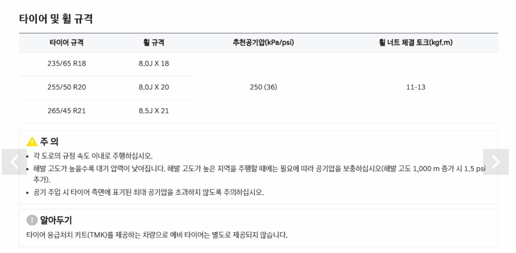 • TMK(타이어 응급처치 키트) 제공 차량으로, 예비 타이어는 별도 제공되지 않습니다.