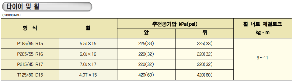 | 형식 | 휠 | 추천 공기압 앞 kPa(psi) | 추천 공기압 뒤 kPa(psi) | 휠 너트 체결토크 (kg·m) |