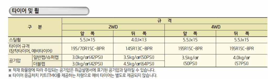 | 스틸휠 | 2WD 일반캡/슈퍼캡 | 5.5J×15 | 4.0J×13 | 앞: 195/70R15C-8PR / 뒤: 145R13C-8PR | 앞: 3.0(42) / 뒤: 3.5(50) |