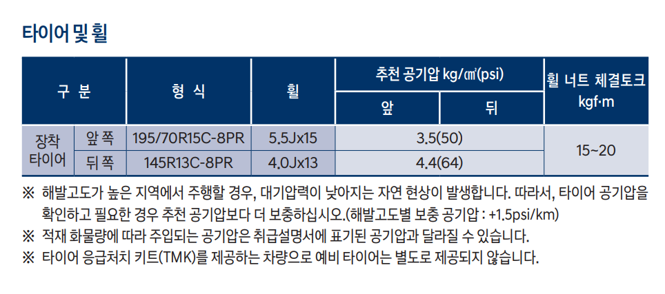 - 적재 화물량에 따라 주입되는 공기압은 취급설명서에 표기된 값과 다를 수 있습니다.