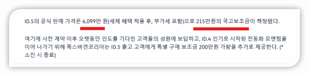 ※폭스바겐 ID5는 약 6,099만원으로, 국고 보조금 215만원 수령이 가능한 가격대에 속합니다.