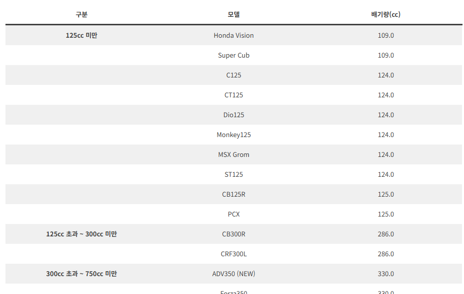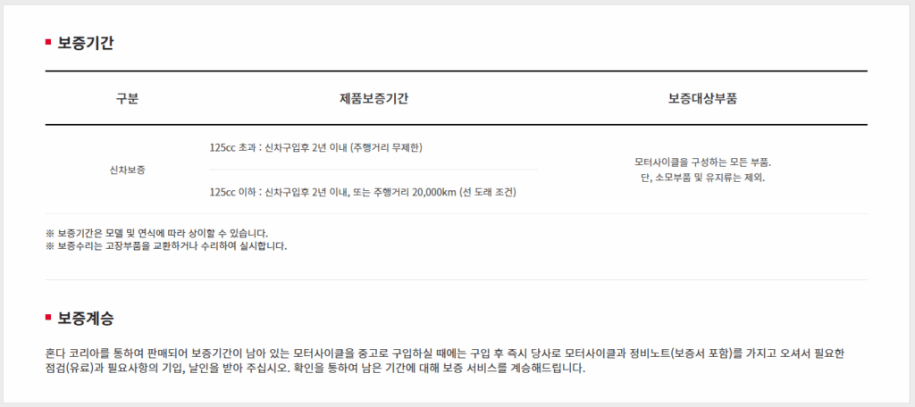 혼다코리아는 모든 모터사이클 구매 고객에게 보증제도를 운영하고 있습니다.