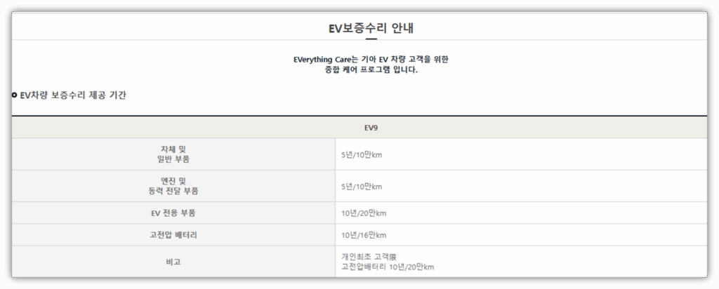 기아 EV 차량의 보증 기간은 항목별로 다르게 적용되며, 개인 최초 출고 고객에 한해 아래와 같은 기준이 적용됩니다.