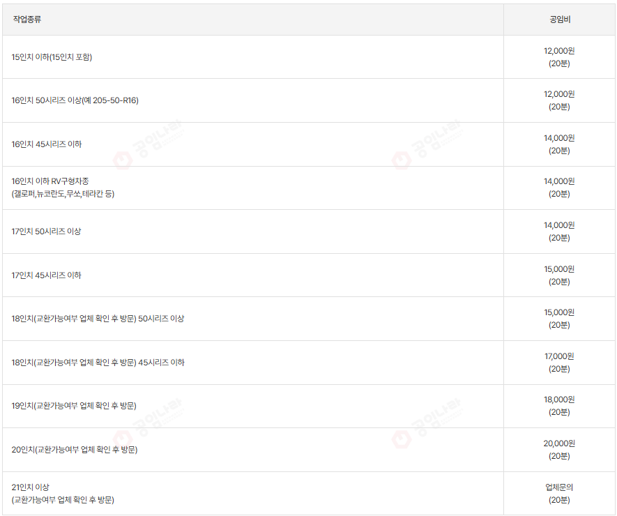 ※ 타이어 가격 및 공임비는 휠 인치에 따라 다소 차이가 발생 될 수 있습니다.