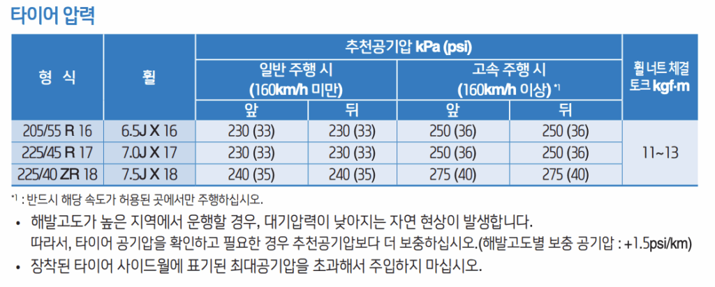 | 형식 | 휠 | 일반 주행 시 (160km/h 미만) 앞 | 일반 주행 시 (160km/h 미만) 뒤 | 고속 주행 시 (160km/h 이상) 앞 | 고속 주행 시 (160km/h 이상) 뒤 | 휠 너트 체결 토크 (kgf·m) |